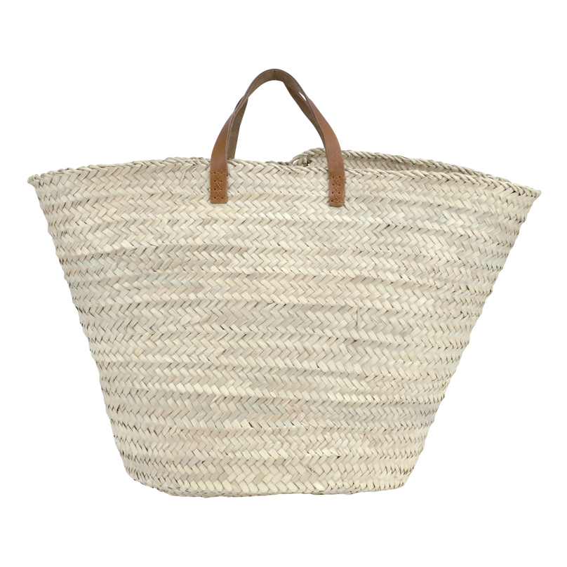Panier Agadir en palme naturelle avec poignées en cuir, parfait pour vos sorties et rangements. Élégant, spacieux et durable.