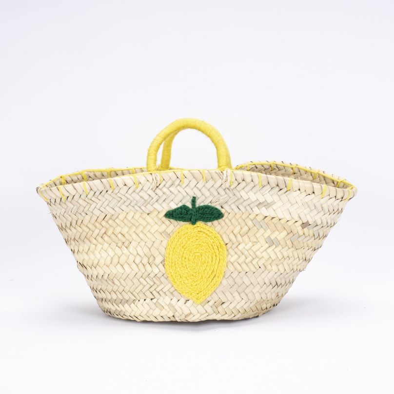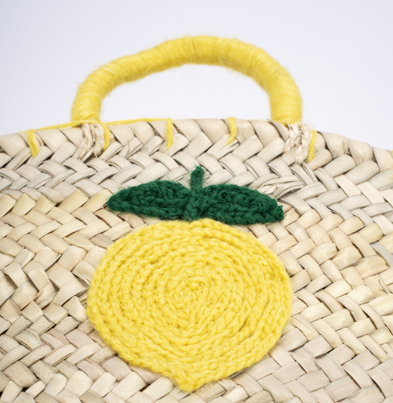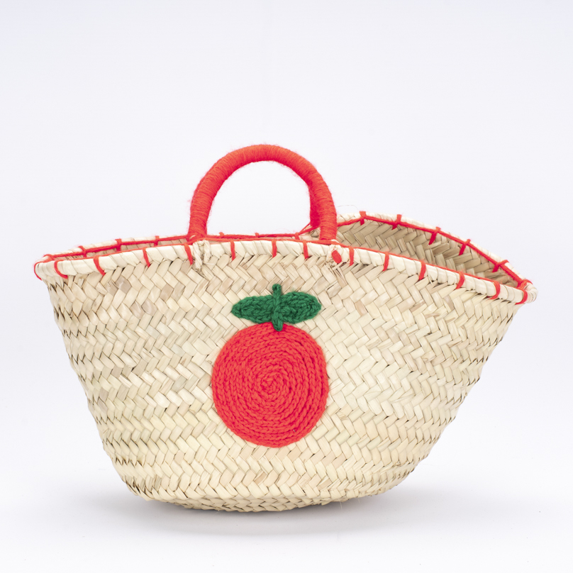 Panier Alhim en palme tressée avec motifs colorés de fruits, idéal pour un style estival. Disponible en plusieurs couleurs vives.