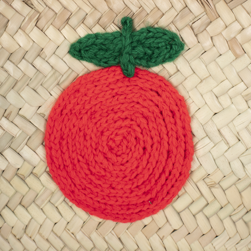 | Caractéristiques | Palme, anses courtes, motif, poignées et tour du panier en tricotin |