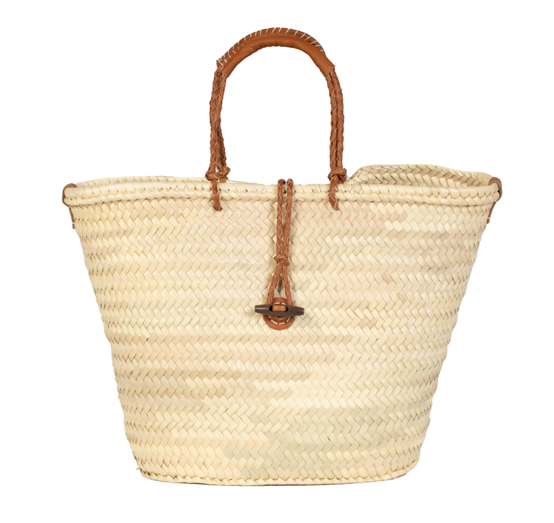 Cabas en palme, finement tressé à la main. Son fermoir en bois et ses poignées en cuir lui donnent un charme simple et naturel.