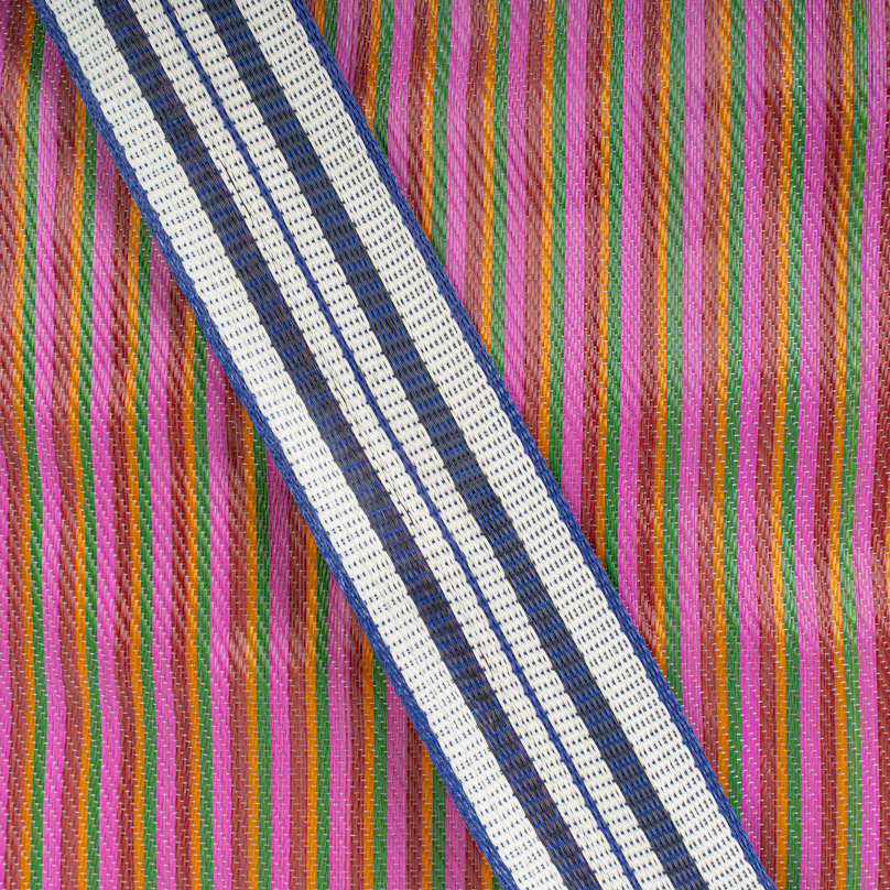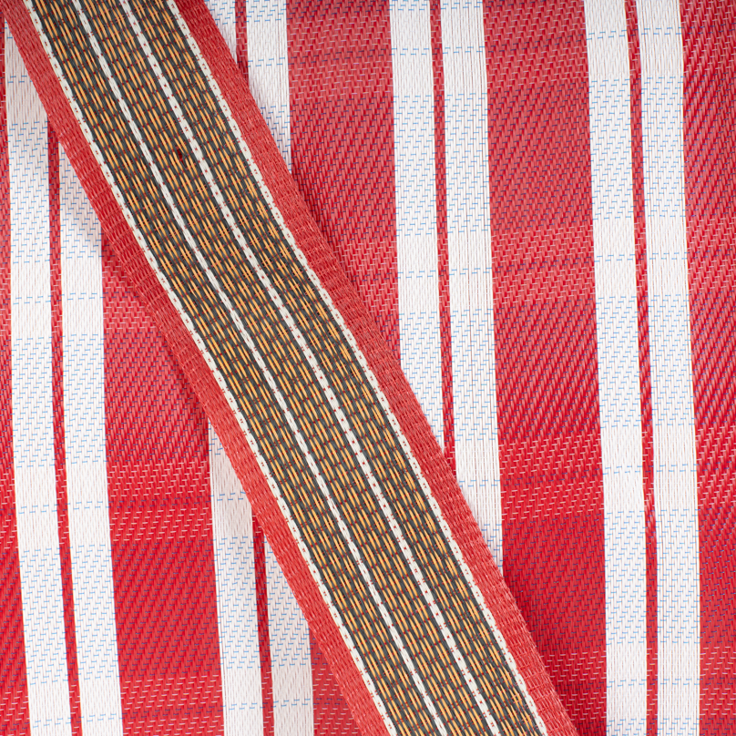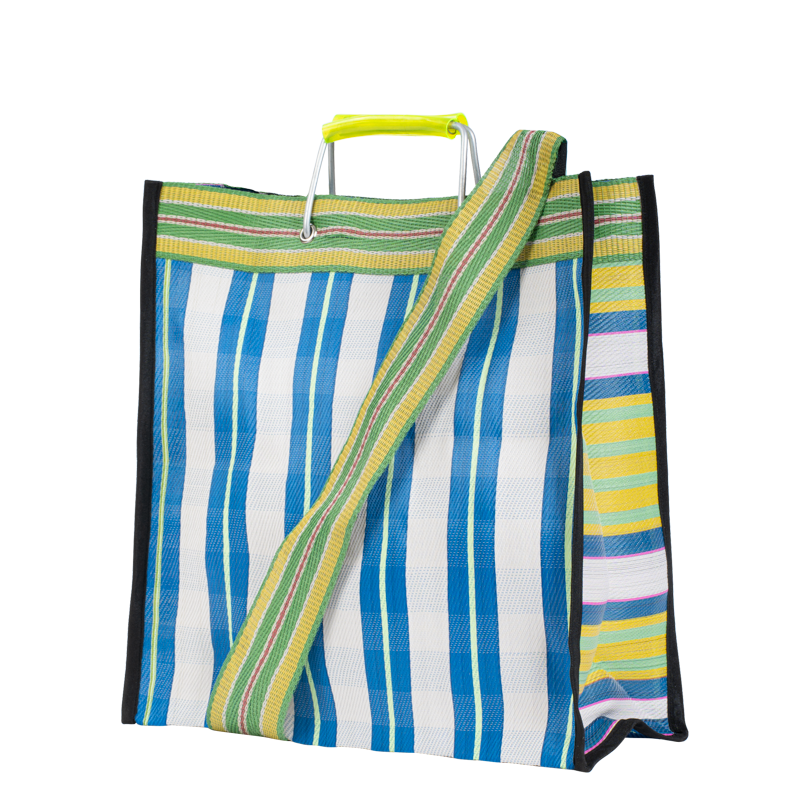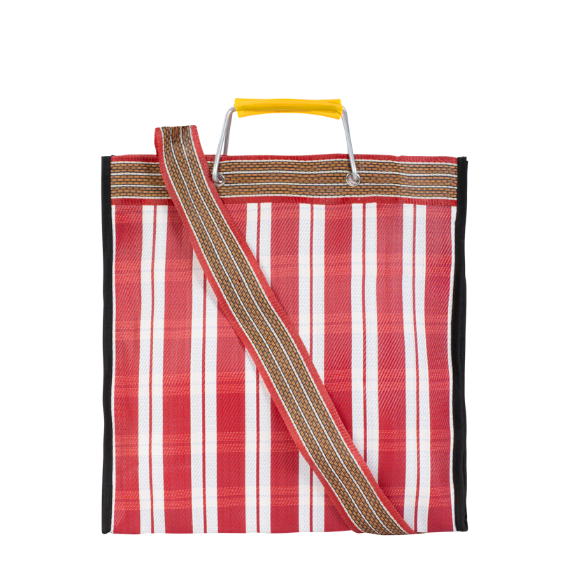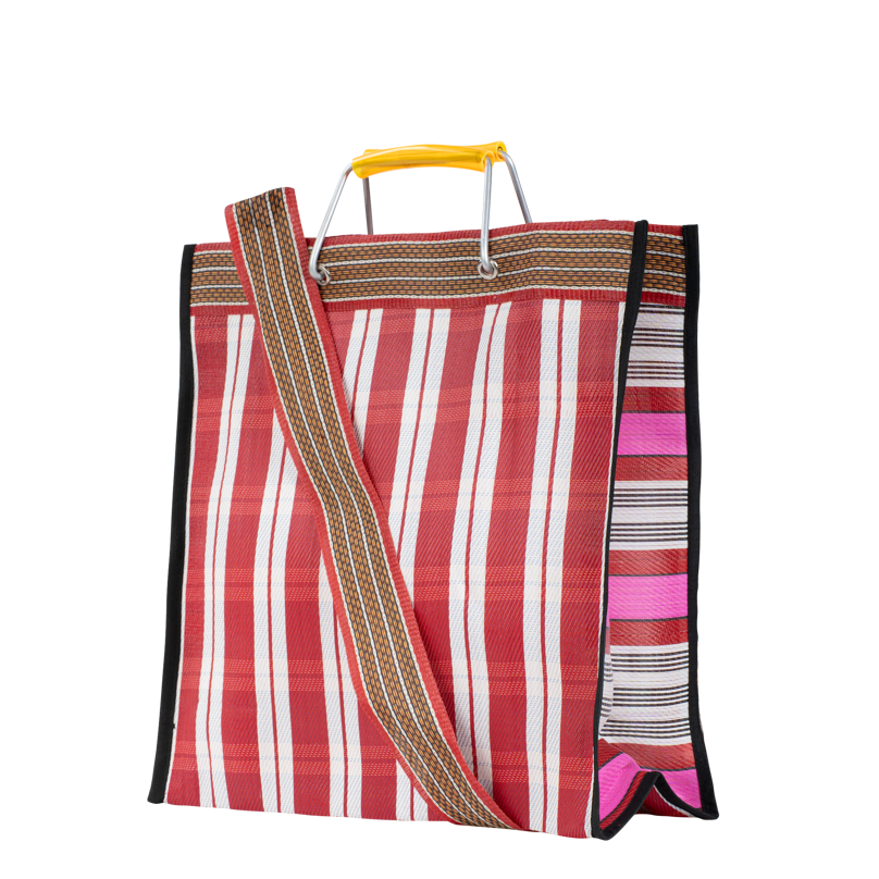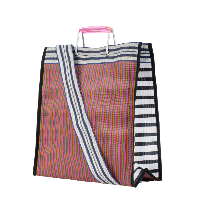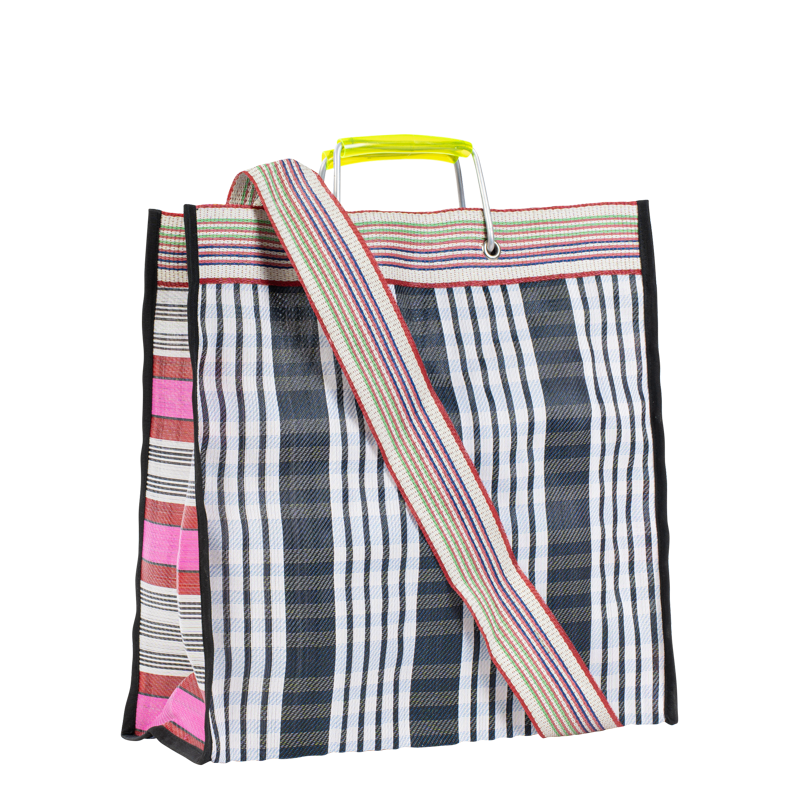 Hampi, le cabas audacieux et coloré en plastique tissé, pratique avec ses doubles anses, à l’épaule ou à la main.