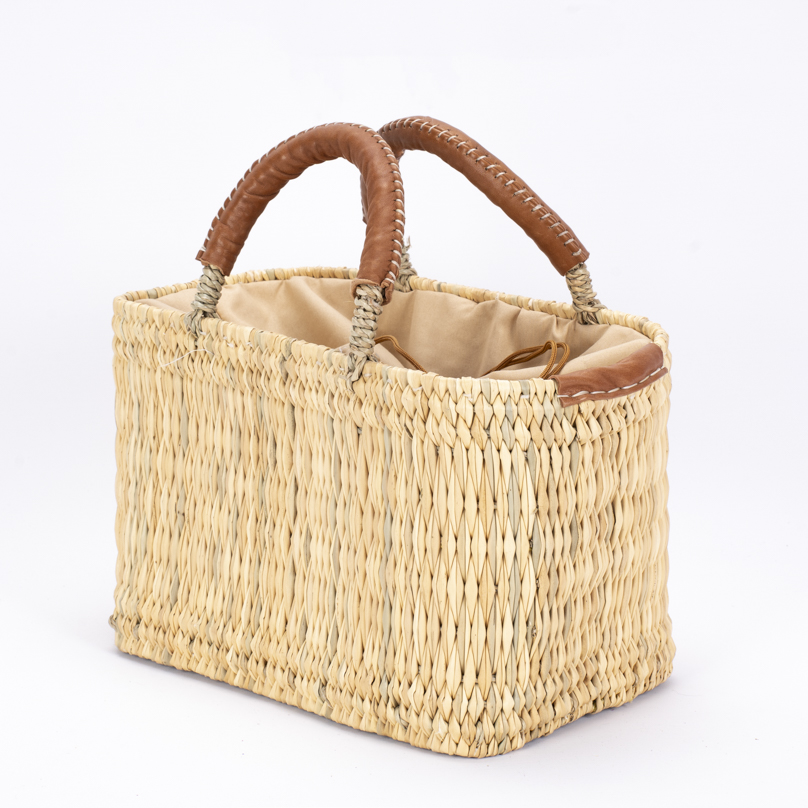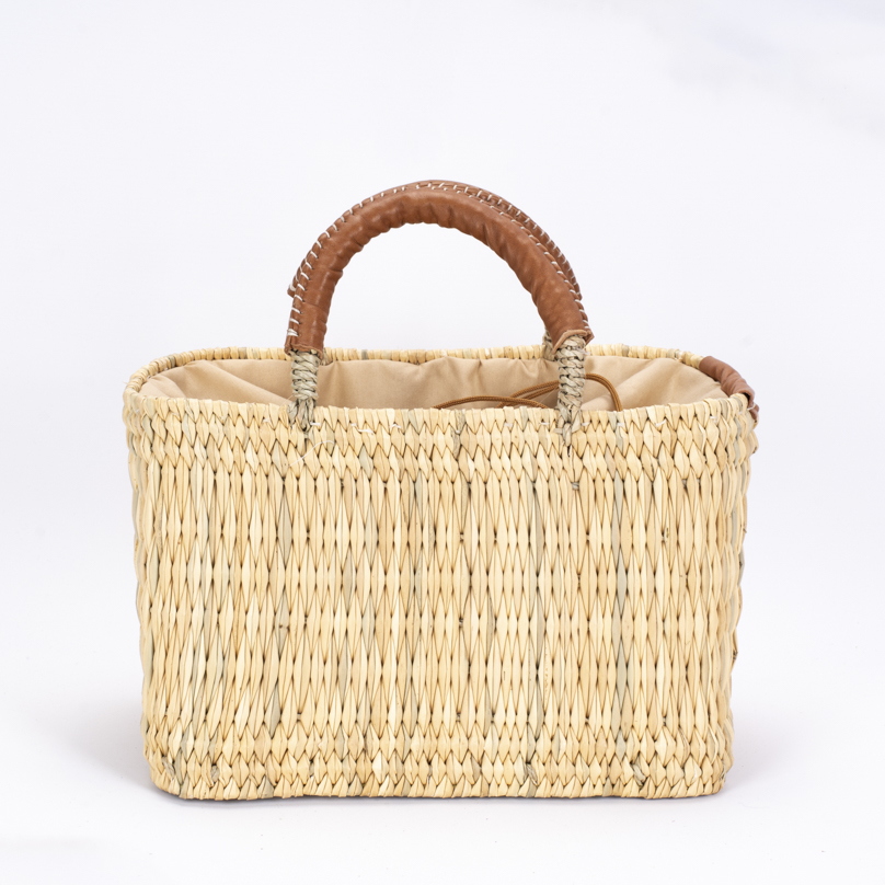 Le cabas jonc Tindi, un panier élégant en jonc tressé avec des poignées en cuir. Parfait pour vos petites courses ou une sortie estivale.