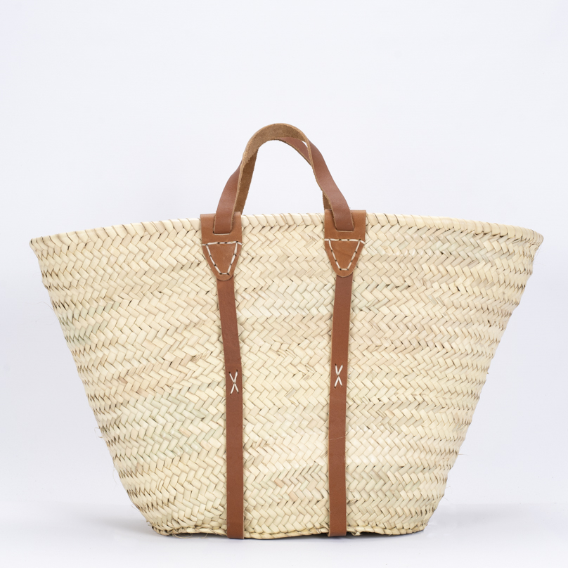 Palme, anses courtes plates en cuir, ceinture en cuir faisant le tour du panier