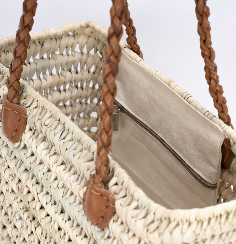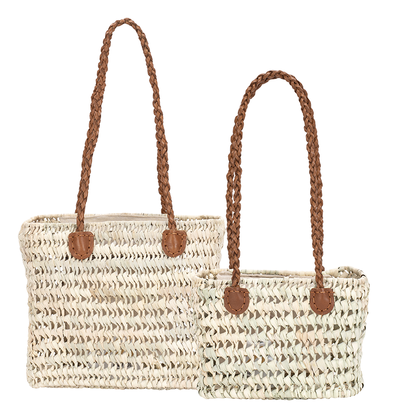 Cabas x2 Mogador en palmier tressé à la main, doté de longues anses en cuir tressé. Parfait pour un usage quotidien avec une touche artisanale.