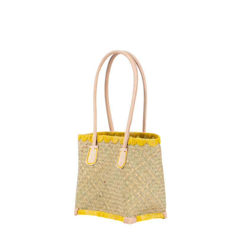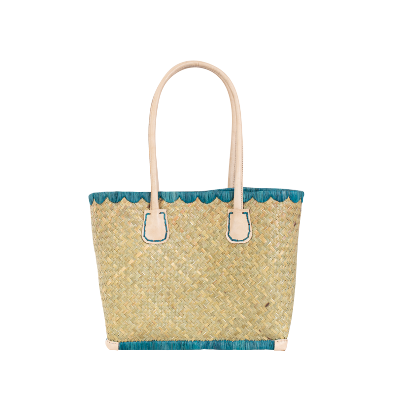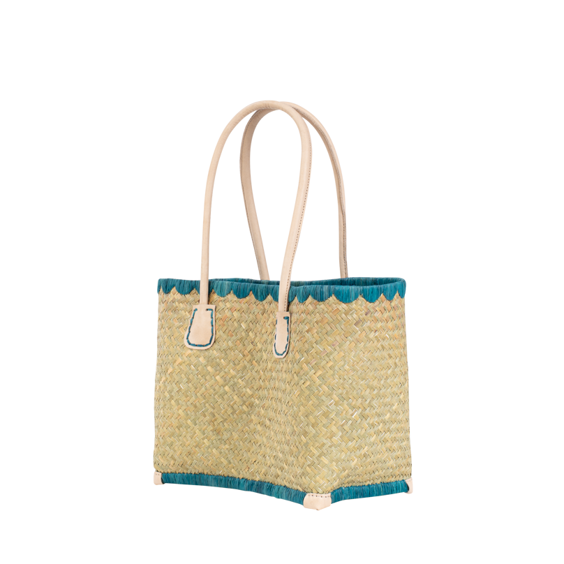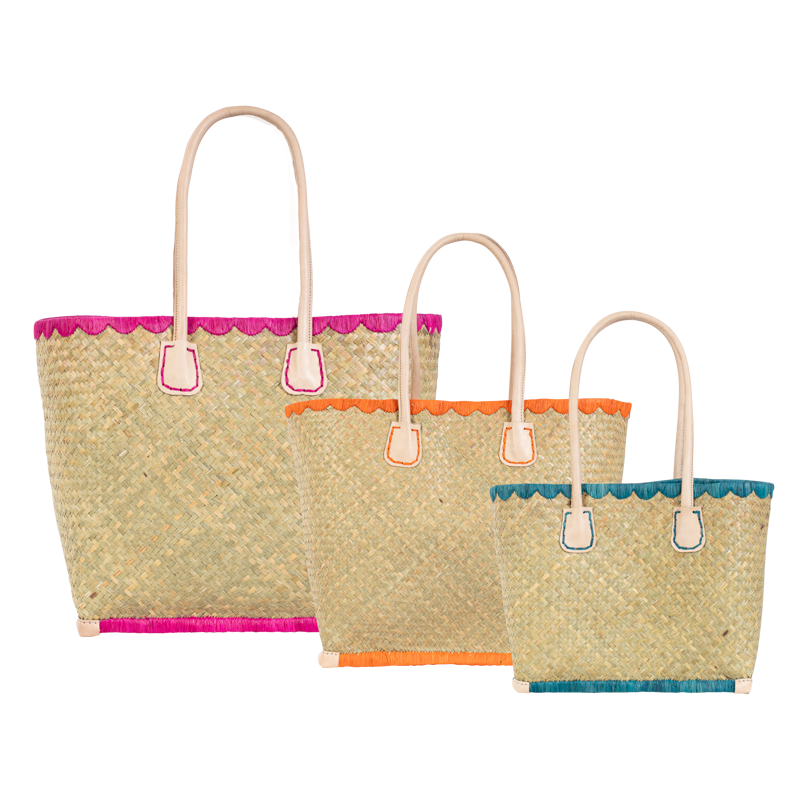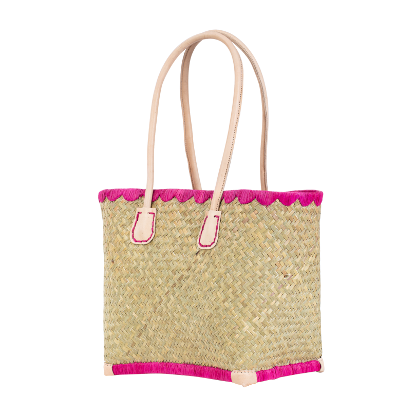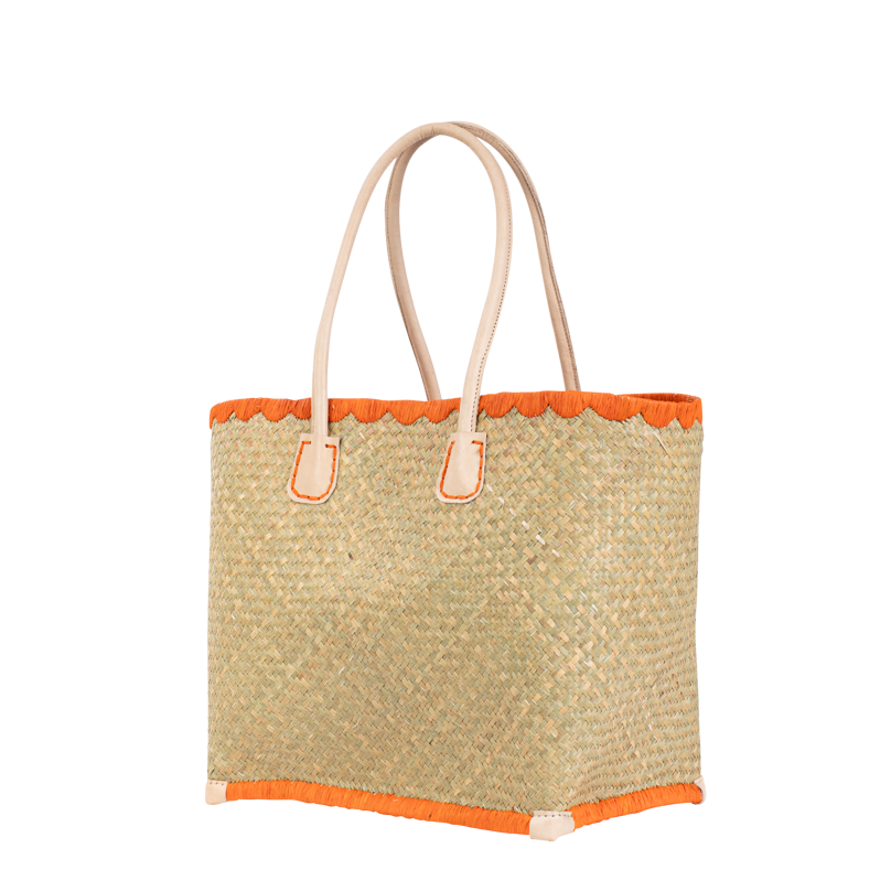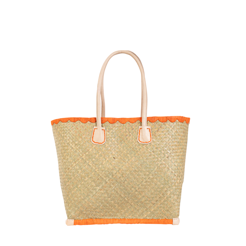 Le cabas Penze en palmier tressé affiche une allure fraîche et colorée, sublimée par des finitions vives et des anses en cuir naturel.