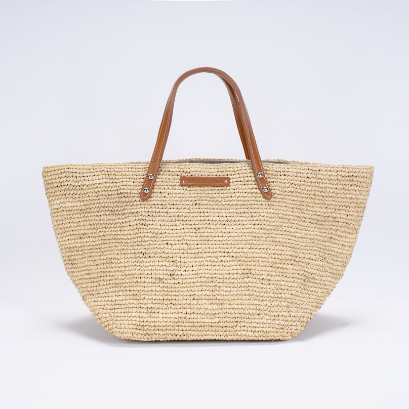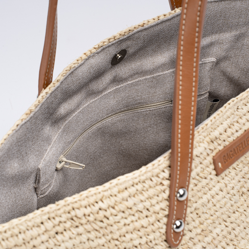 | Caractéristiques | Raphia crocheté, anses cuir, fermeture zip, doublure intérieure |